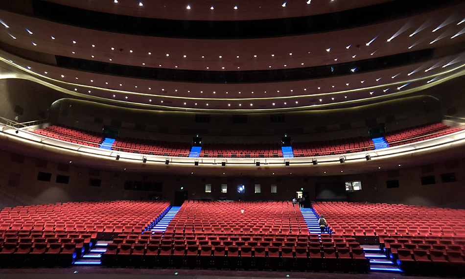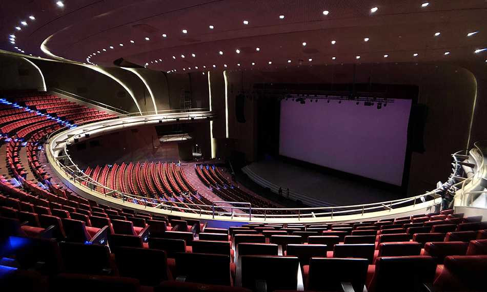 位于青島市黃島區(qū)西海岸經(jīng)濟新區(qū)中央商務(wù)區(qū)內(nèi),總建筑面積約2.4萬平米,包含一個1970座的特大型劇院及設(shè)施的配套空間。大劇院是為國際電影節(jié)打造的文化建筑,舉辦一年一度的國際電影節(jié),成為電影節(jié)開、閉幕式及頒獎典禮的圣殿。大劇院需滿足大型文藝演出、現(xiàn)場交響樂演奏、全景聲電影放映的需求,這就要求大劇院擁有三套不同的聲學(xué)系統(tǒng):現(xiàn)場演出擴聲系統(tǒng)、全景聲電影還音系統(tǒng)、電子可變混響系統(tǒng)。仁歌技術(shù)團隊經(jīng)過精心設(shè)計、制作,實現(xiàn)了三套系統(tǒng)既可以獨立工作,又能夠在不同使用需求時系統(tǒng)的智能結(jié)合。